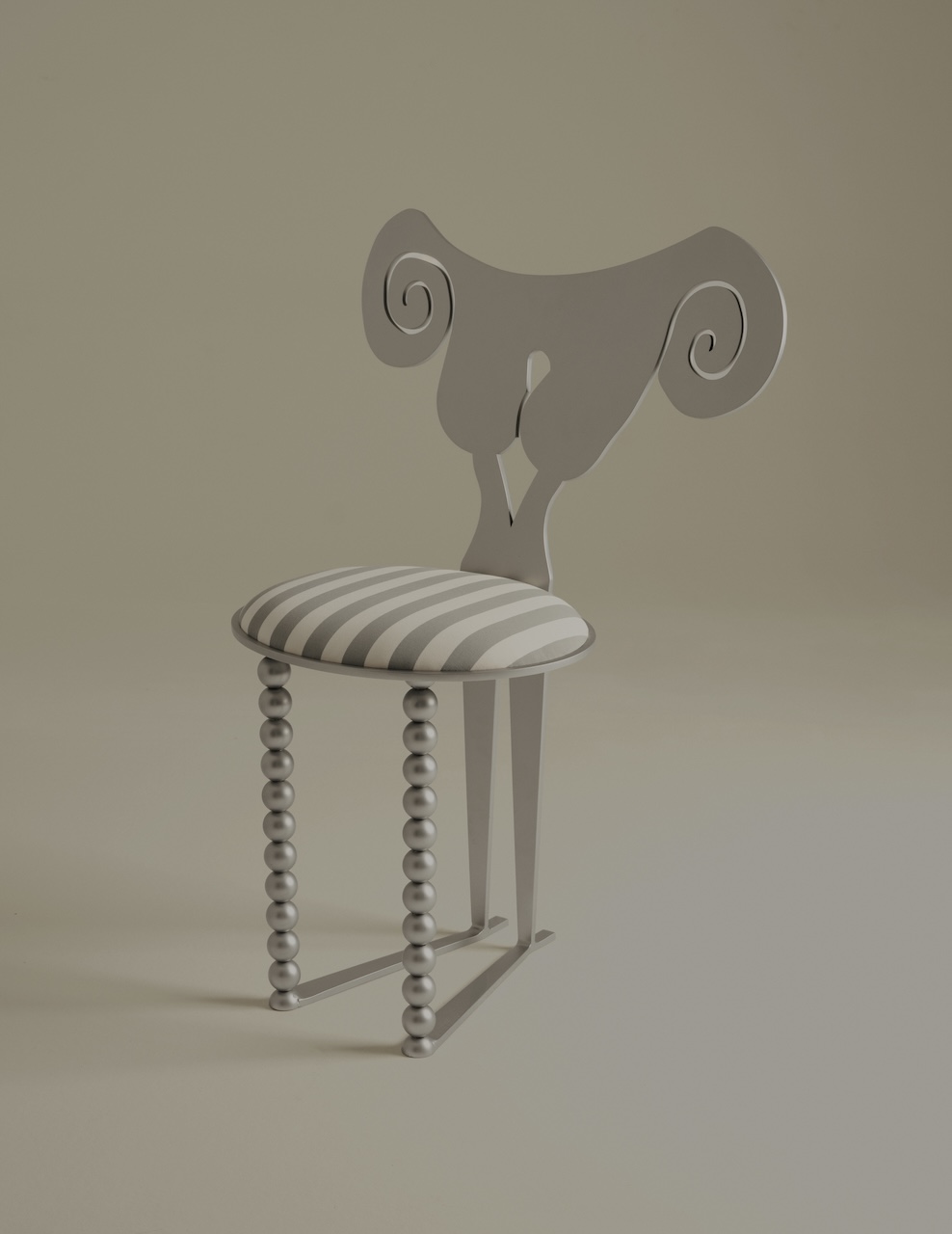 Born from the myth of Amaltheia, the horn of plenty takes shape as a sculptural chair. Its spiral back embodies fertility in motion, a continuous rhythm where life and form converge. Guided by this cadence, the striped seat balances graphic precision with a playful ease, lending the piece a quiet vitality. Cast in aluminum, the chair lives effortlessly outdoors and lends its sculptural composure to interiors. Alma speaks in the language of form, translating narrative into a living presence.