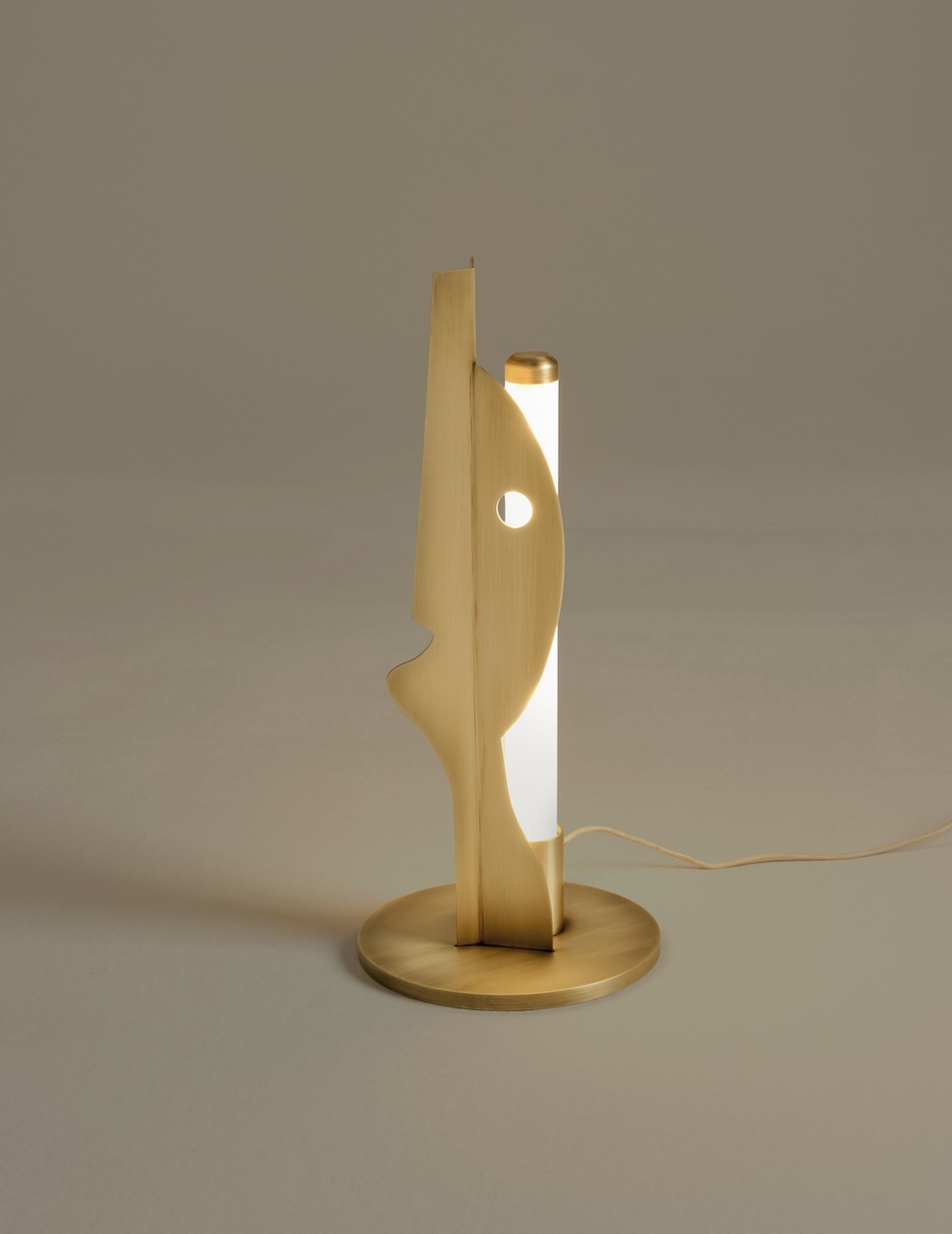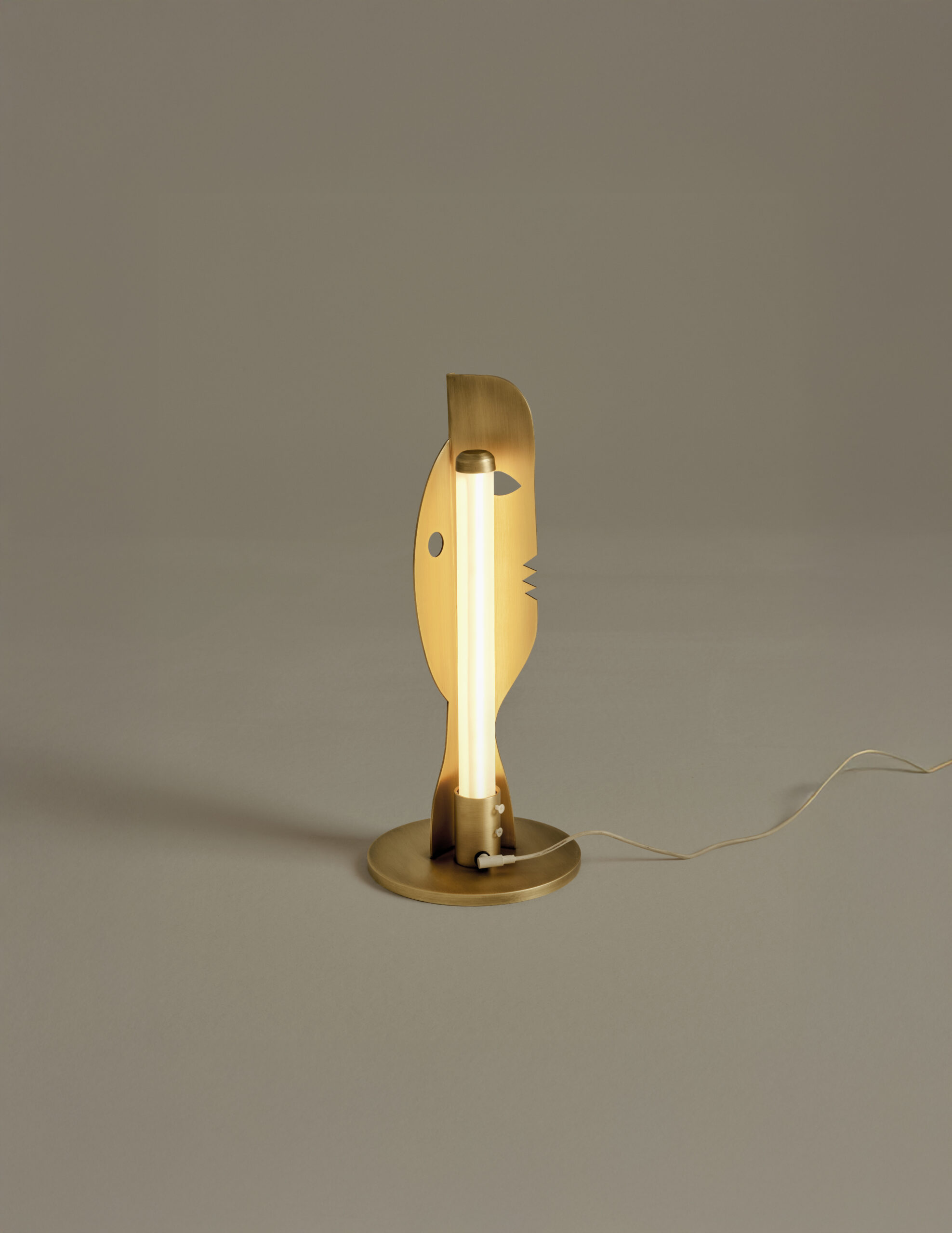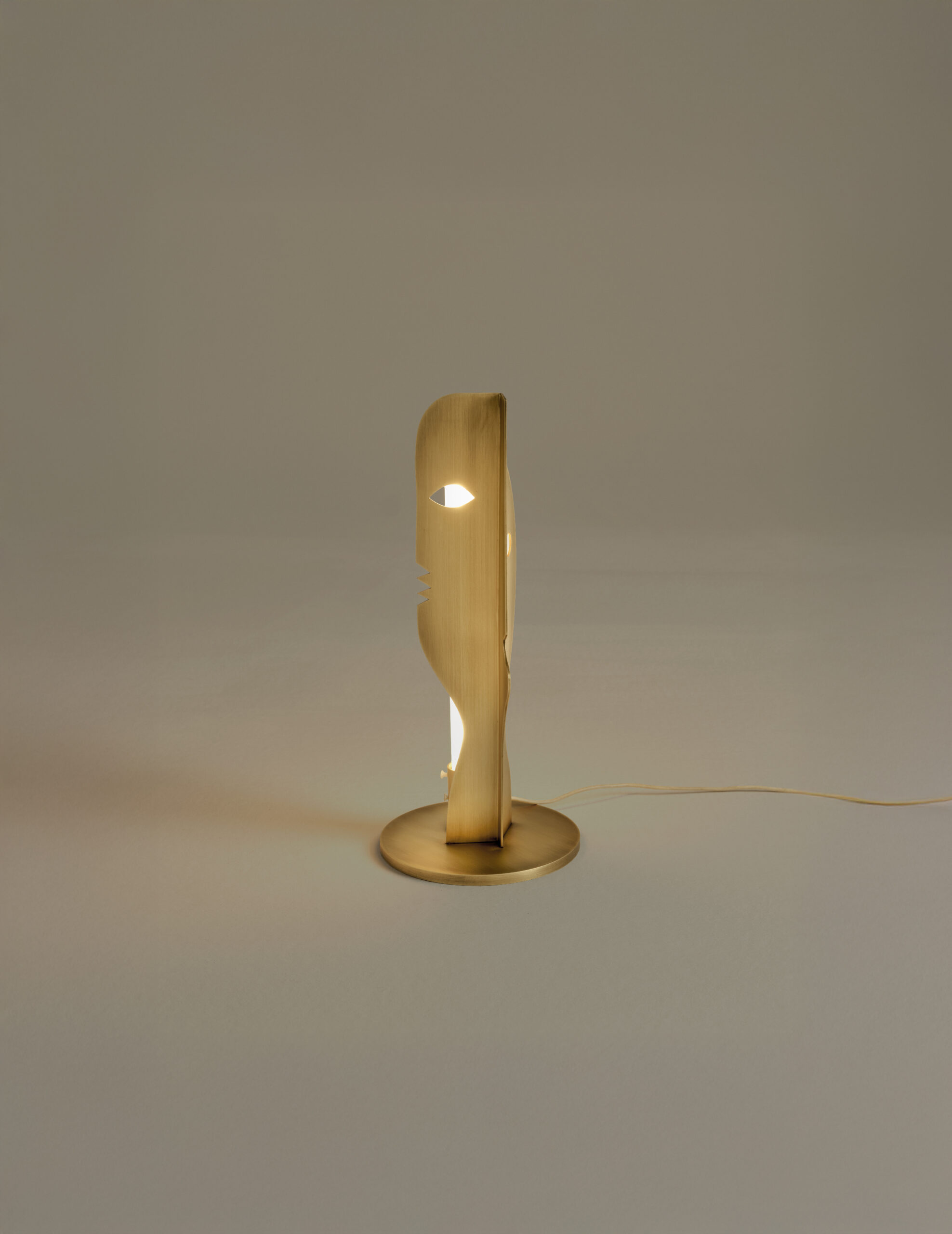 Deramo Lamp finds its inspiration in Sophie Taeuber-Arp’s Stag King, a Dada-era puppet theatre where figures took shape within a liminal aesthetic between human and object. Formed in gold-finished metal, light flows through the eyes of the figure, animating the face with a quiet expression. When off, it exists as sculpture; when illuminated, it performs as light.