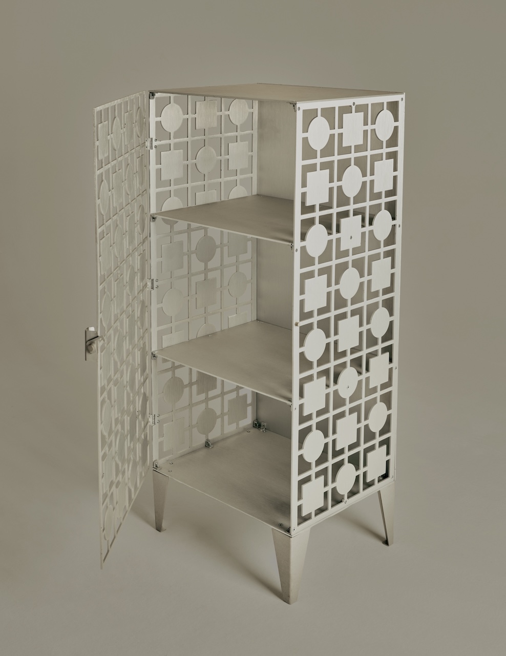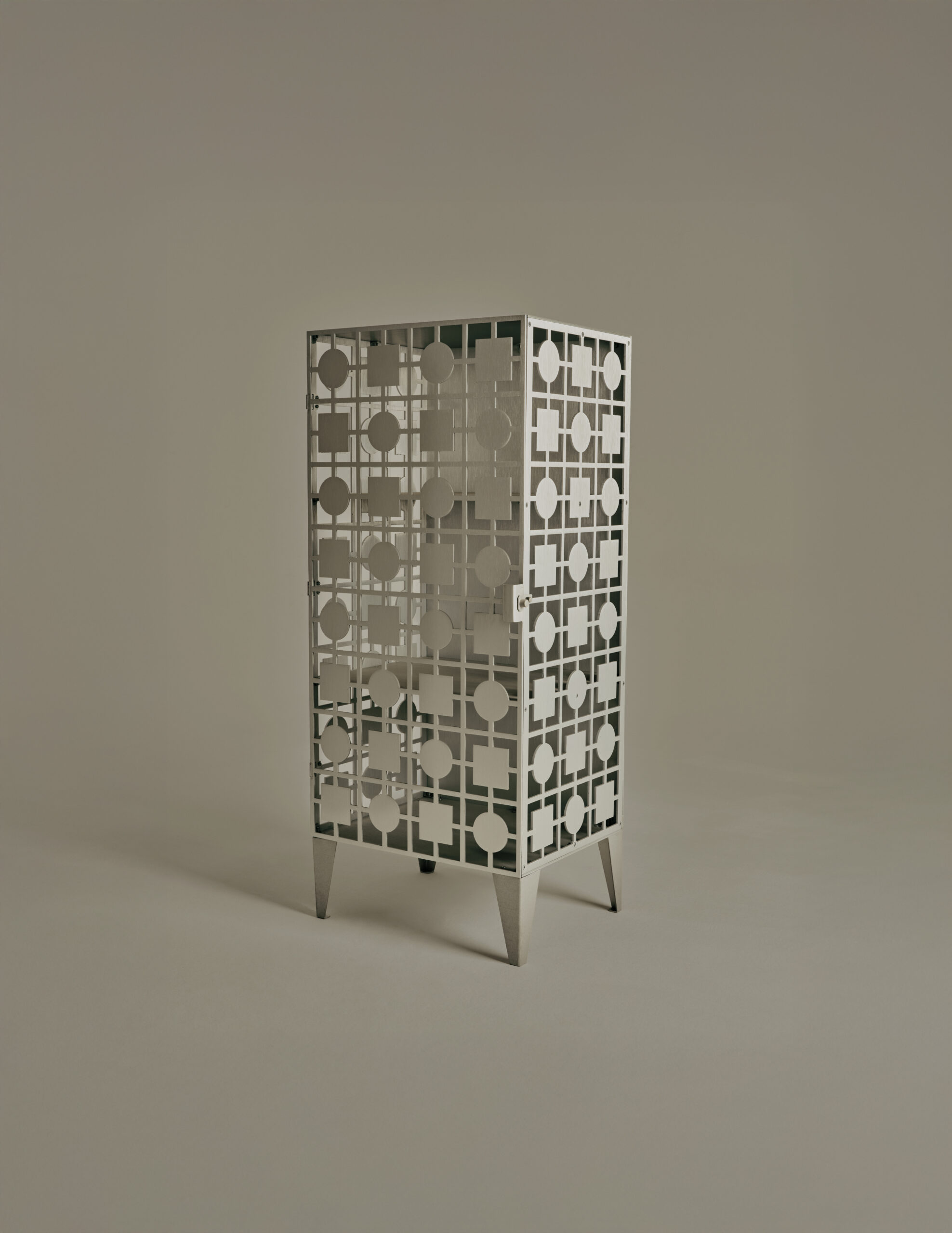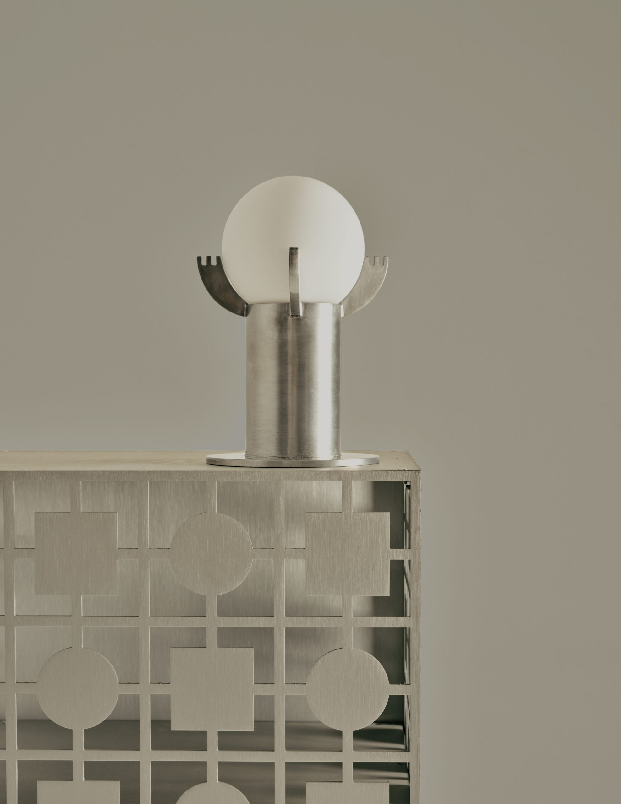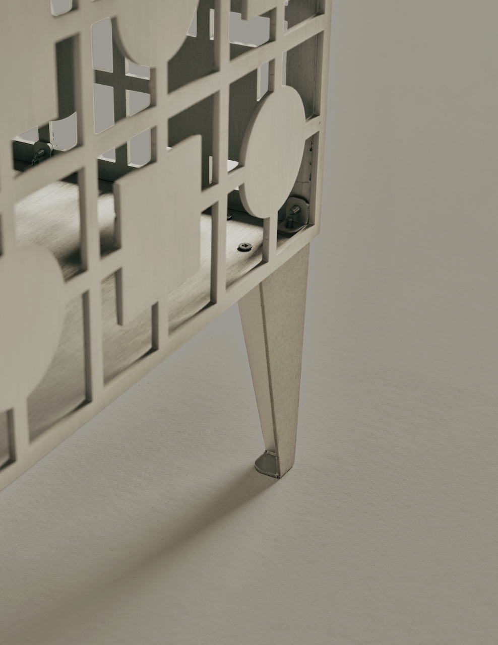 Inspired by Sonia Delaunay’s stage costumes, where geometry became performance, the cabinet channels that sense of movement through form. Light drifts across the open silhouette, revealing its structure with quiet precision. Defined in brushed anodized aluminum, the piece balances intention and emotion, turning function into quiet poetry. Sona stands as a sculptural statement, where light and reflection define the rhythm of space.